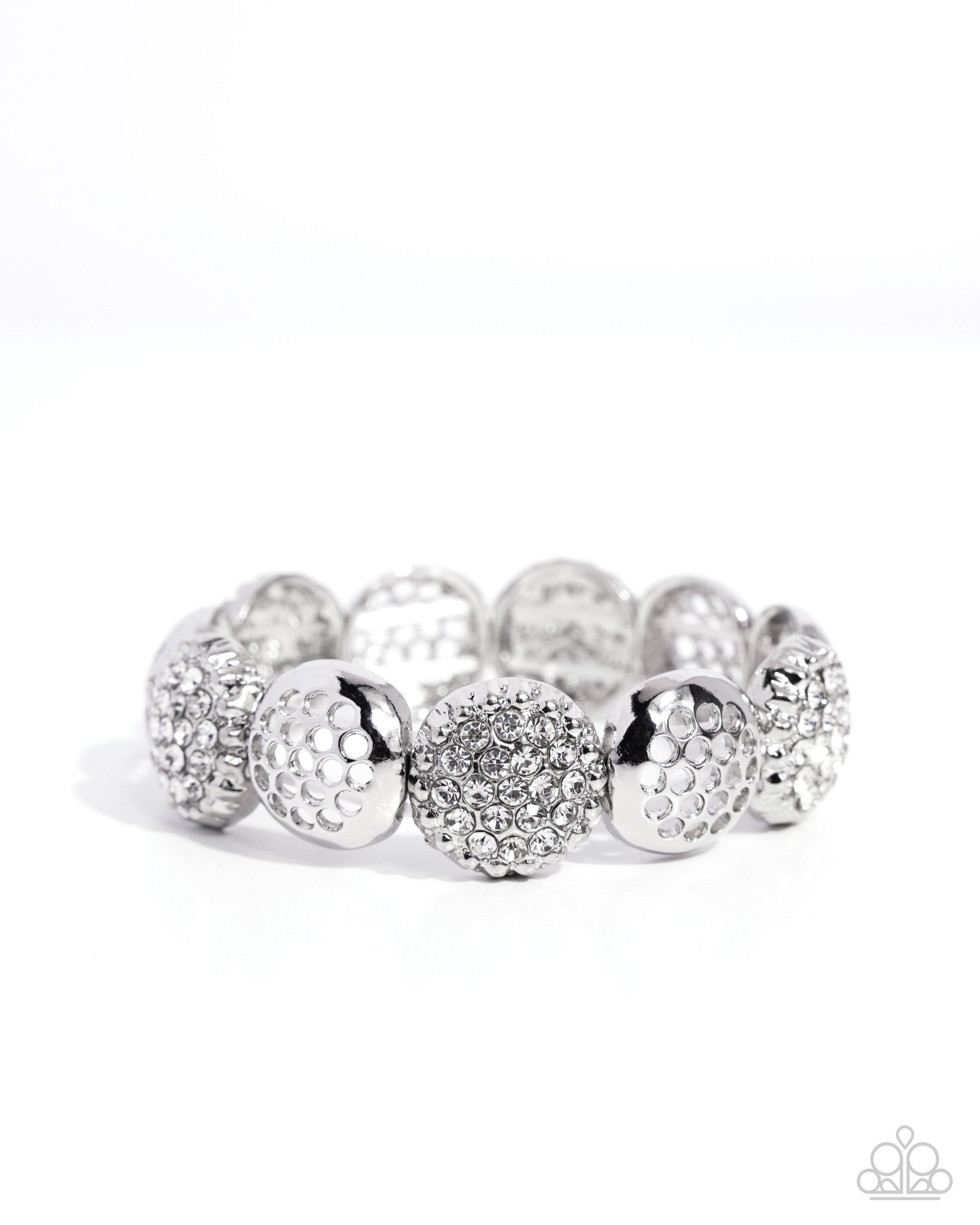 Infused along elastic stretchy bands, a rounded silver disc dotted with airy holes alternates with a hammered, rounded disc embellished in white rhinestones for a grungy glittery display.