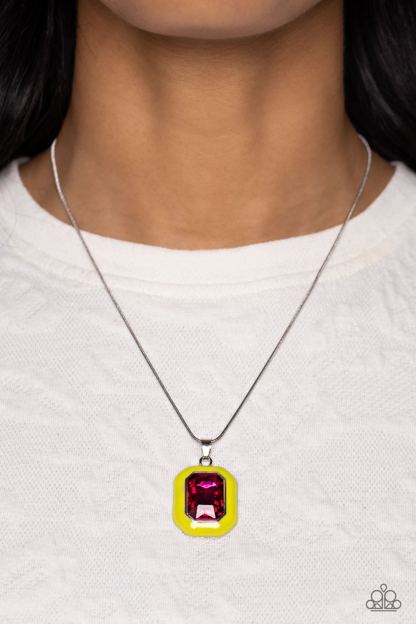 An oversized, fuchsia emerald-cut gem is bordered by a frame of neon Love Bird, creating a bright pendant that swings from the bottom of a silver snake chain. Features an adjustable clasp closure.