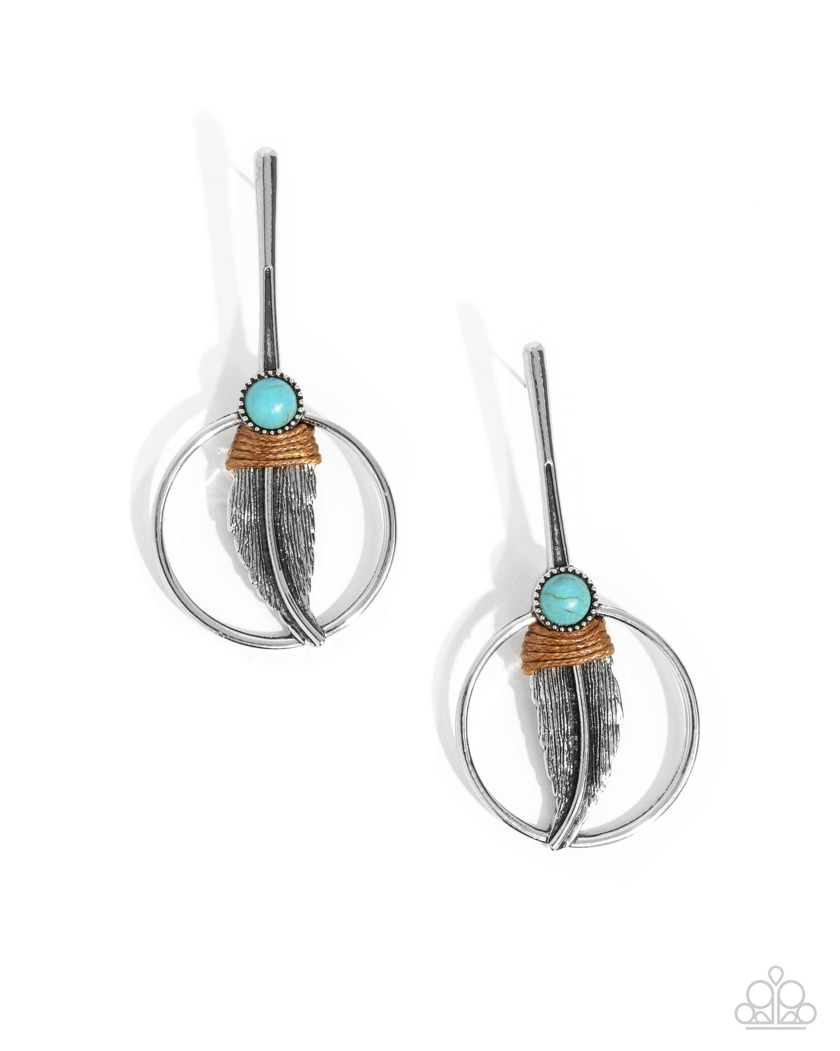 Pressed in a studded silver frame, a turquoise stone gives way to a textured silver feather, suspended along the center of a glistening silver hoop from an elongated silver fitting for a free-spirited lure. Rows of brown twine are wrapped along the base of the feather, meeting the turquoise stone for additional rustic detail. Earring attaches to a standard post fitting. As the stone elements in this piece are natural, some color variation is normal.