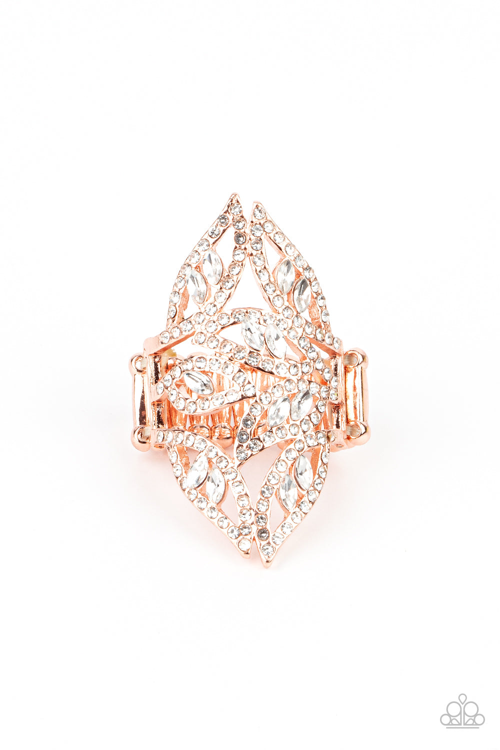 A glitzy collision of white marquise rhinestones floats inside rhinestone-encrusted copper leaf-shaped frames that dance across the finger resulting in a glamorous finish. Features a stretchy band for a flexible fit.