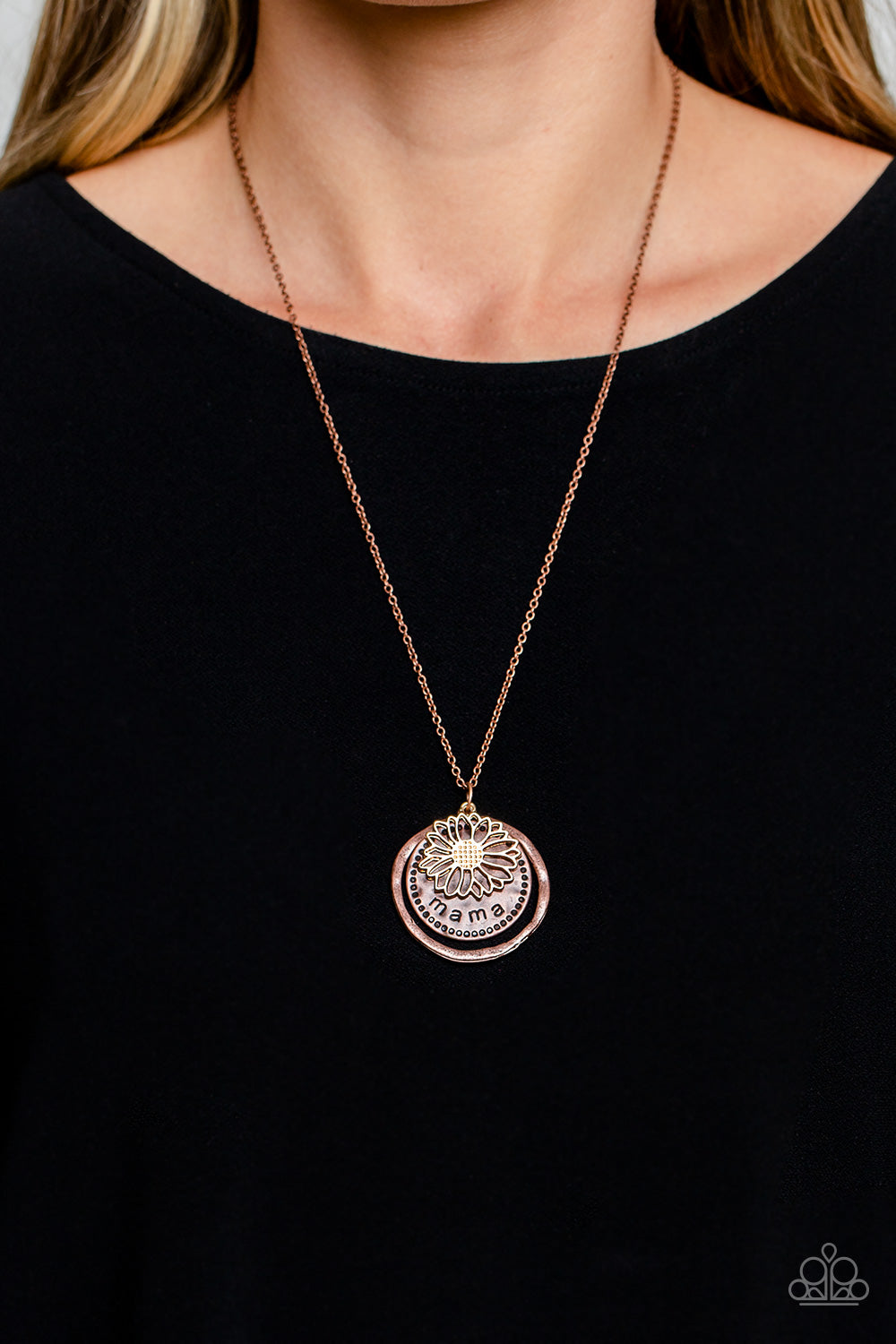 An oversized hammered copper disc swings from the top of an imperfect, hammered copper hoop, creating an authentically artisan pendant at the bottom of a copper chain. Featured on the border of the oversized disc, a row of stamped holes outline the word "mama." Overlaying the top of the copper hammered disc, an intricately-detailed gold flower silhouette rests for a floral finish. Features an adjustable clasp closure.