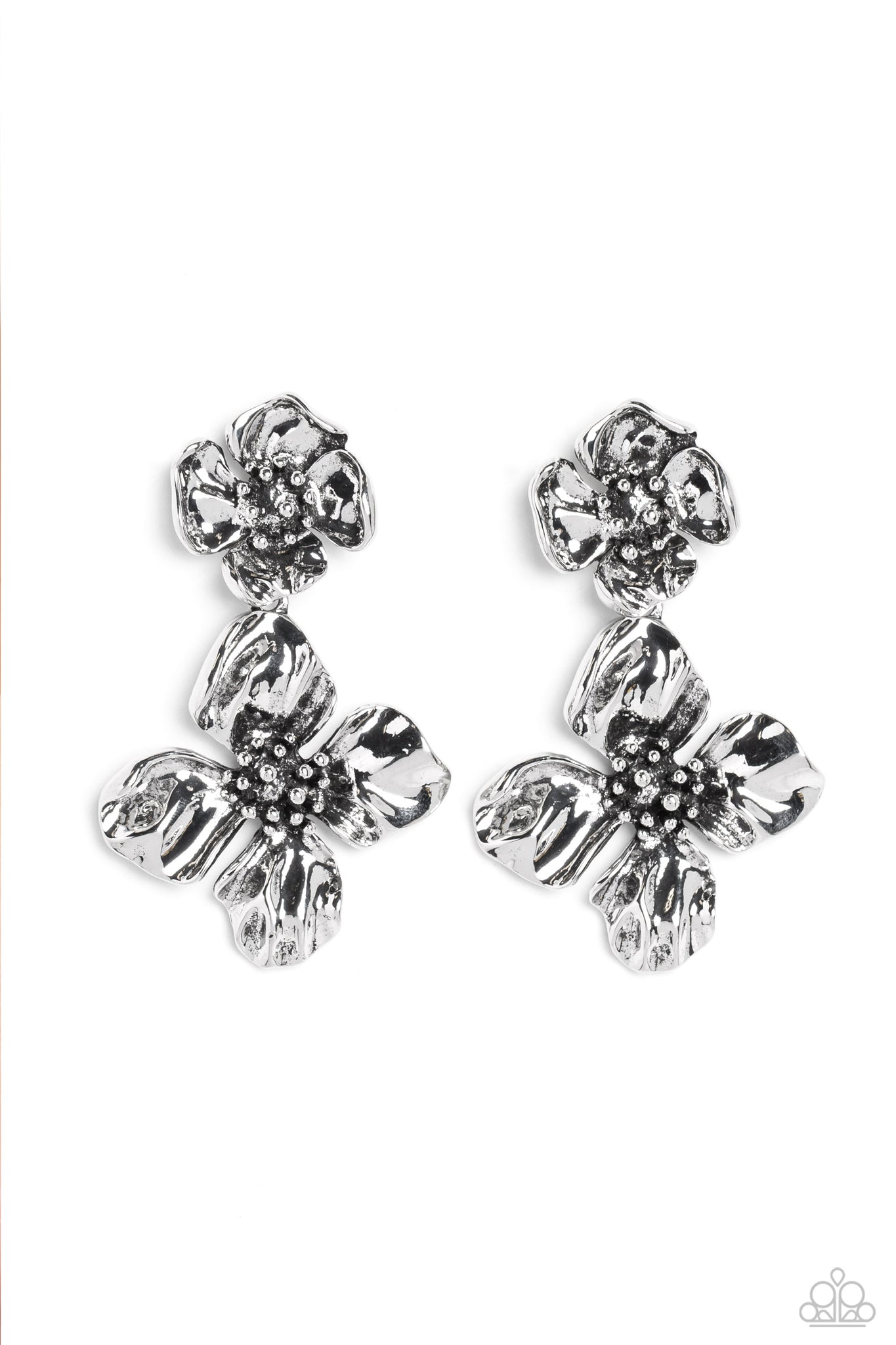 Featuring a warped metallic texture, an oversized silver flower hangs from a smaller silver flower for a whimsical finish. Dainty silver studs coalesce the centers of each flower, adding tactile detail to the floral design. Earring attaches to a standard post fitting.
