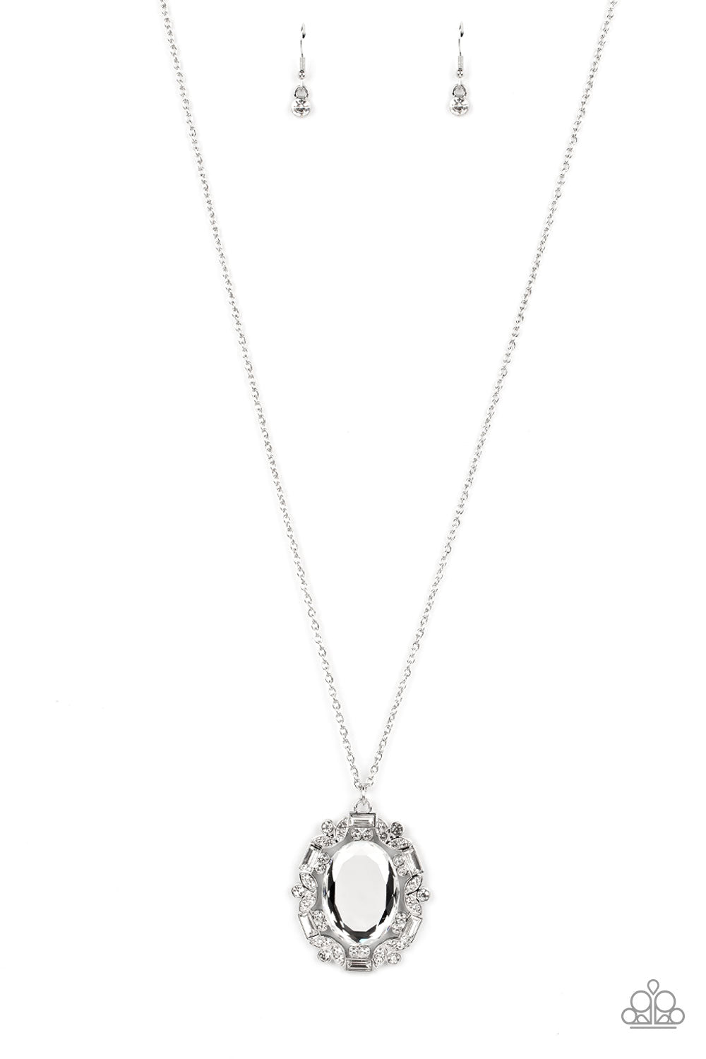 A dramatically oversized white oval gem takes on a mirror-like sheen as it swings from the bottom of a long silver chain. White emerald-cut and dainty, round rhinestones create an airy frame that wraps around the reflective centerpiece, scattering light in every direction in a blinding finish. Features an adjustable clasp closure.