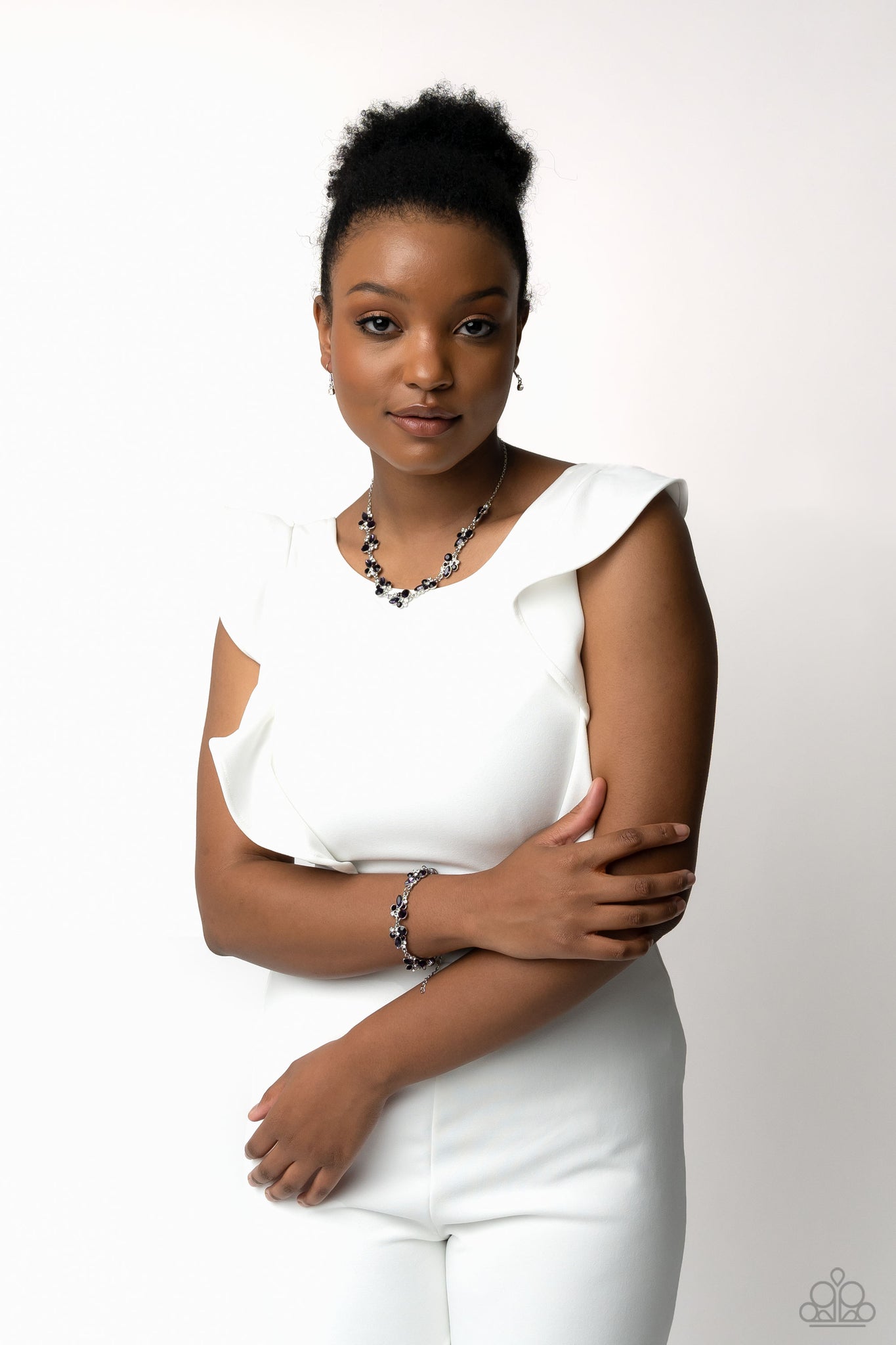 An eclectic collection of white and amethyst round rhinestones in varying sizes and marquise-cut gems in a shade of purple cluster around the wrist in high-sheen silver frames. Patterned in an abstract manner, the clusters interlock together, emitting light from every faceted angle. Features an adjustable clasp closure.
