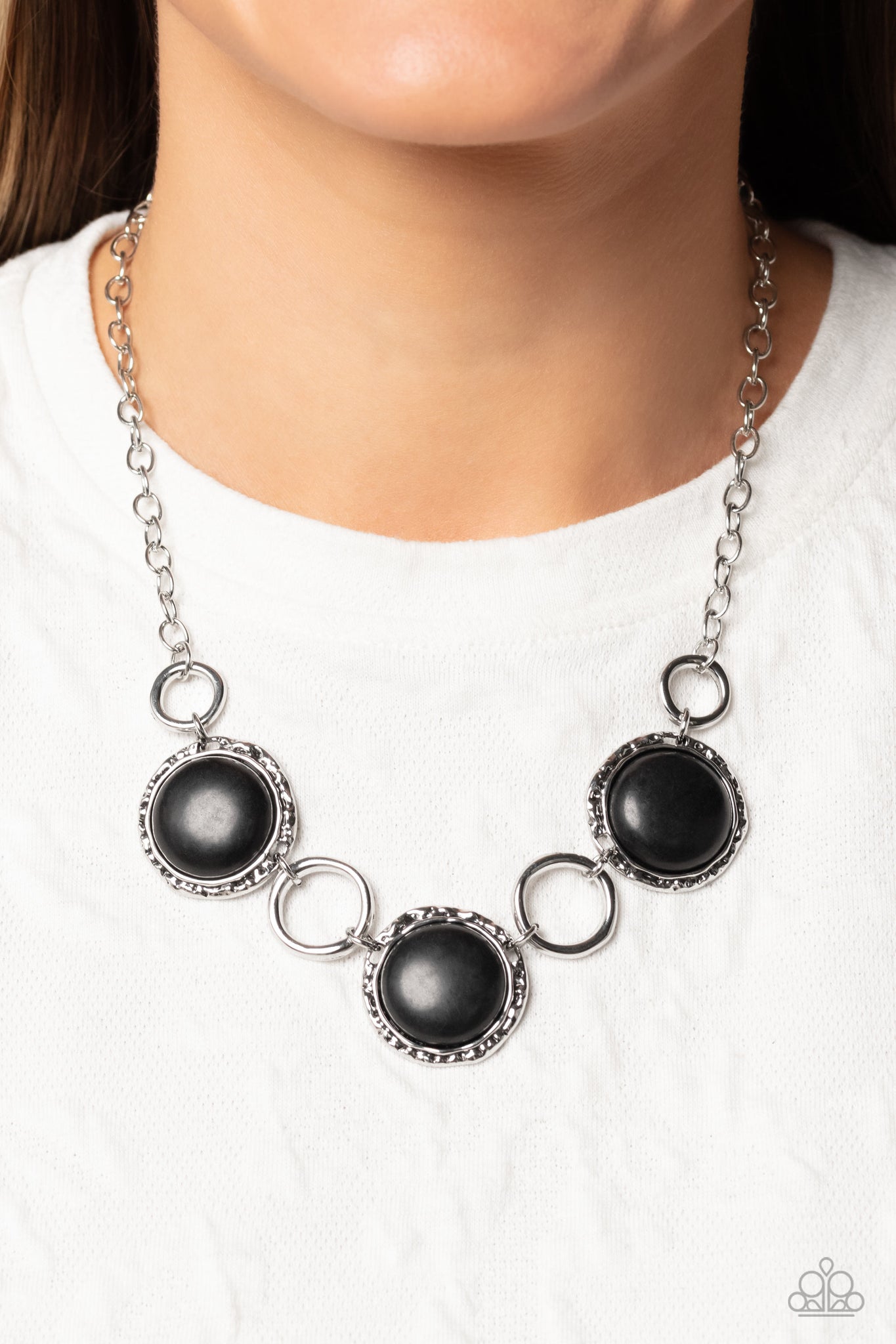 Warped silver hoops in varying sizes alternate along hammered silver frames. Pressed into the hammered frames, oversized black stones add a vibrant, earthy flair to the summery palette. Features an adjustable clasp closure. As the stone elements in this piece are natural, some color variation is normal.