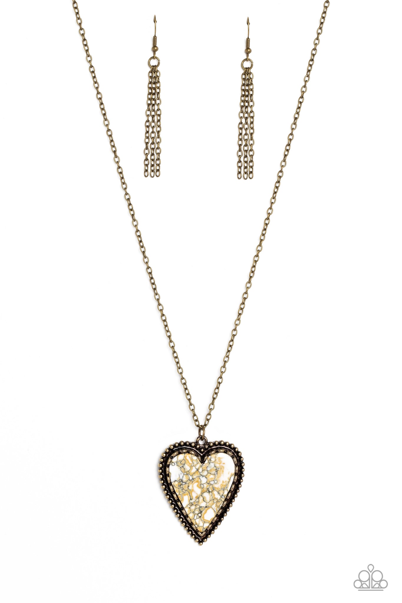Pressed in the center of a brass chain and studded frame, an oversized, white marbled stone heart pendant rustically falls down the chest from a classic brass chain. Features an adjustable clasp closure. As the stone elements in this piece are natural, some color variation is normal.