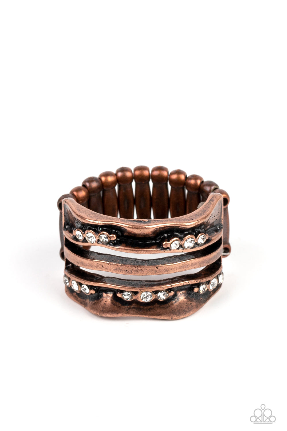 Dotted with dainty white rhinestones, warped folds of copper create wavy copper bars across the finger, invoking rustic refinement. Features a stretchy band for a flexible fit.